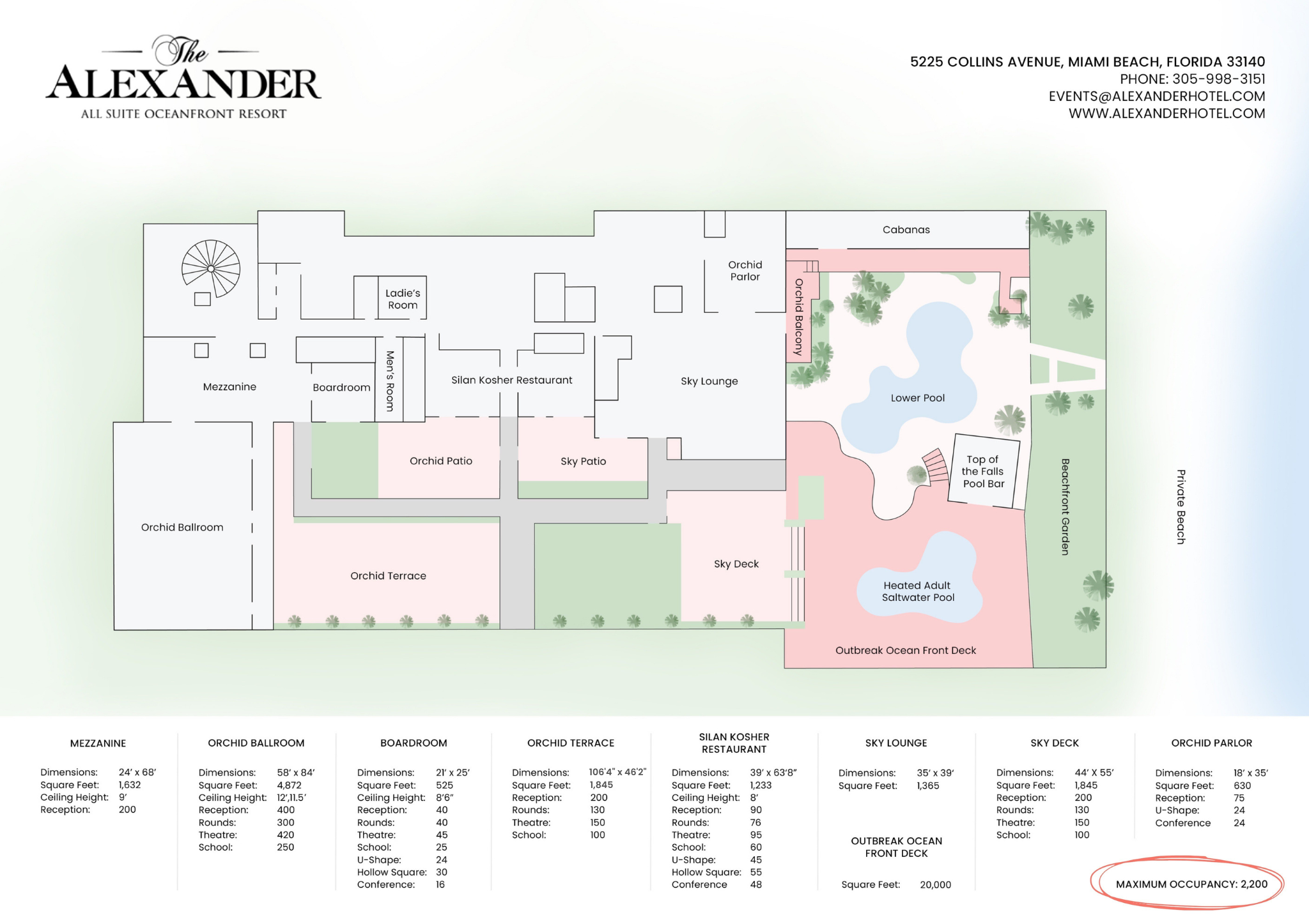 Discover the perfect space for your event by exploring our site map, which includes detailed dimensions of each venue. With a total capacity of up to 2,200 guests, we offer a variety of indoor and outdoor options to accommodate gatherings of all sizes. Whether you're planning an intimate celebration or a grand affair, you'll find the ideal setting to suit your needs.